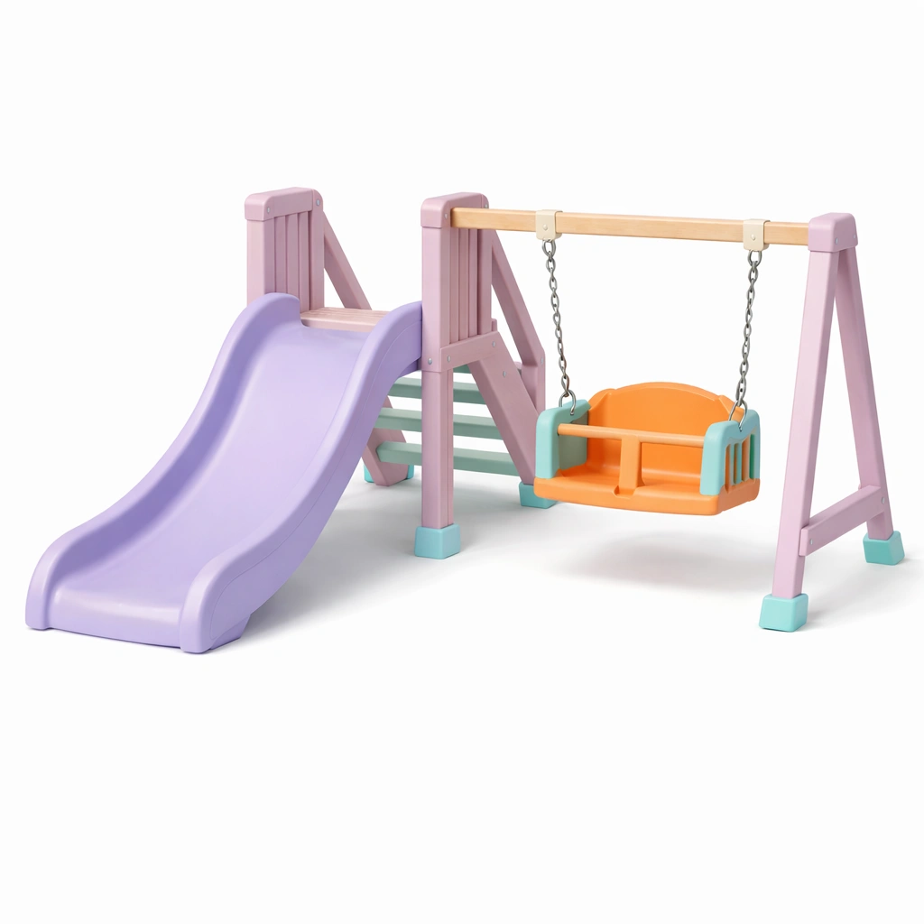 Il set include uno scivolo in plastica resistente di 150 cm di lunghezza e un'altalena con catene in metallo e sedile in plastica. Struttura progettata per uso esterno, garantisce stabilità e sicurezza. Adatto per bambini dai 3 ai 7 anni. Conforme agli standard di sicurezza EN 71.